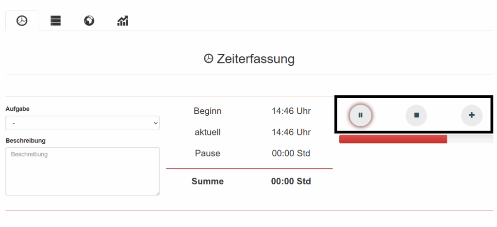 Mit den drei Schaltflächen (hier eingerahmt) können Sie Ihre Arbeitszeit Pausieren und Stoppen. Die Pausen werden automatisch mit eingerechnet und von der Gesamtarbeitszeit abgezogen.