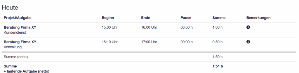 Mit Klick auf das + können Sie Zwischenschritte speichern. Dies ist besonders dann nützlich, wenn Sie an verschiedenen Aufgaben und Projekten, denen Sie zugeteilt sind, arbeiten. Die erfassten Zeiten werden Ihnen wie folgt weiter unten auf der Zeiterfassungsseite angezegit.