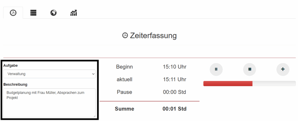 Unter Aufgabe und Beschreibung können Sie das die Aufgabe auswählen, an der Sie gerade arbeiten und eine Beschreibung hinzufügen. Die Beschreibung wird automatisch übernommen, sobald Sie sie eingetragen haben.