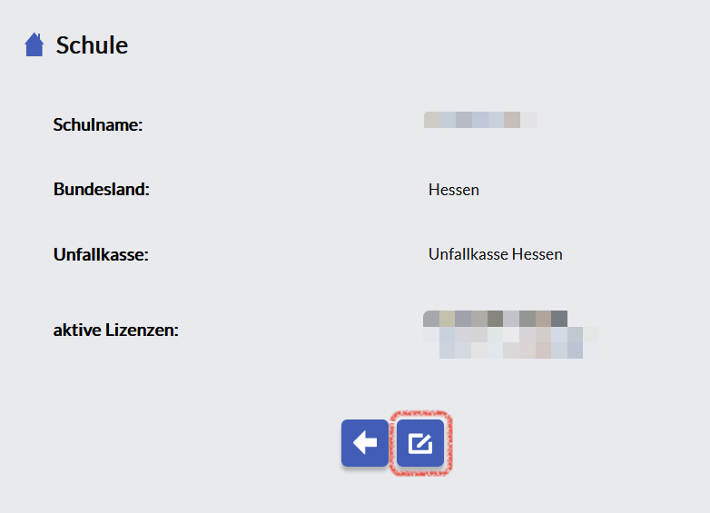 1. Klicken Sie diesen an, sehen Sie an dieser Stelle die hinterlegten Daten Ihrer Schule. Hier sehen Sie auch Ihre aktive Lizenz. Klicken Sie unten auf das Bearbeiten-Symbol, um diese Daten anzupassen.