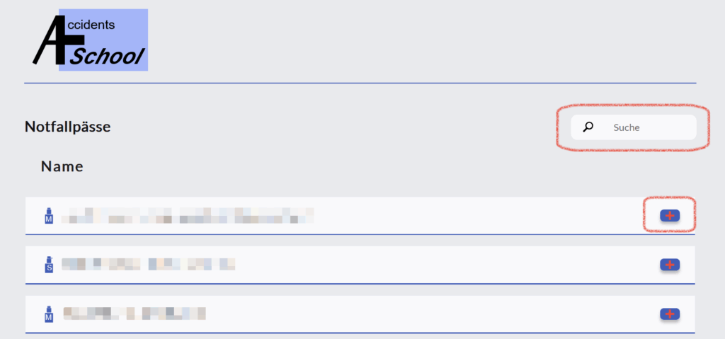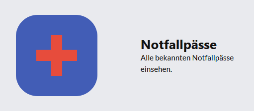 Notfallpässe Klicken Sie im Hauptmenü auf Notfallpässe. Dort sehen Sie alle Benutzer:innen. Neben jedem Namen sehen Sie das Notfallpass-Symbol. Mit einem Klick darauf können Sie den Notfallpass, sofern er angelegt wurde, von dieser Person einsehen. Um den Notfallpass einer verunfallten Person schneller aufzufinden, geben Sie deren Namen in das „Suche“-Feld oben rechts ein!